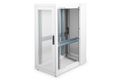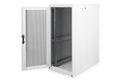 Die 483 mm (19")-Schränke der Dynamic Serie wurden für einen einfachen und besonders kostenoptimierten Netzwerkausbau entwickelt. Durchdachte Platzierungen der Kabeleinlässe bieten je nach Anwendungsfall eine mühelose Installation. Im Bodenchassis befindet sich dieser, geschützt durch eine verschraubte Abdeckplatte, mittig im hinteren Bereich. Schränke ab 800 mm Breite werden zusätzlich durch Kabeleinlässe mit Kunstoffabdeckung links und rechts erweitert. Diese sind ebenfalls im Dach (1 x bei 600 mm Schrankbreite, 3 x bei 800 mm Schrankbreite) integriert. Für die Aufnahme eines Lüftermoduls wird das Dachchassis ebenfalls mit einem ausgestanzten Bereich versehen. Zwei Paar galvanisierte, mit in beide Richtungen ablesbare Höheneinheiten beschriftete 483 mm (19")-Profilschienen sind im Inneren verbaut. Sie lassen sich in der Tiefe verstellen und sind mit zusätzlichen Tiefenstreben im Schrank verbunden. Jeder Schrank ist eine robuste Stahlkonstruktion aus bis zu 1,5 mm starkem Stahlblech. Die Farbgebung erfolgt in Form von elektrostatischer Pulverbeschichtung in den Standardfarben Grau (RAL 7035) und Schwarz (RAL 9005). Abnehmbare Seitenwände sowie die abschließ- und abnehmbare perforierte Front- und Rücktür, verbessern die Zugänglichkeit. Ein Türanschlagswechsel kann vorgenommen werden. Des Weiteren sind die Schränke auf Grund der zerlegbaren Konstruktion bei Bedarf komplett demontierbar.