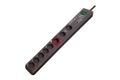 - Steckerleiste mit beleuchtetem Sicherheitsschalter zum Ein- und Ausschalten (zweipolig) und je einer Funktionskontroll-Leuchte für Überspannungsschutz und Slave-Steckdosen
