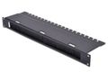 Die Kabeldurchführungspanel werden an den 483 mm (19“)-Profilschienen befestigt. Die Öffnung verfügt über eine Bürstenleiste, welche das Beschädigen von durchgeführten Rangierkabeln verhindert. Eine Rückseitige Ablagefläche mit Kabelfixierungsbügeln für bis zu 24 Kabel rundet das Design der Panel ab und ermöglicht somit ein optimales Kabelmanagement in Ihrem 483 mm (19“) Netzwerk- oder Serverschrank.