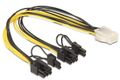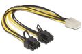 Dieses Delock Stromkabel dient zur Stromversorgung von PCI Express Karten, die eine hohe Leistungsaufnahme haben und zwei 8 Pin bzw. zwei 6 Pin Stromanschlüsse besitzen, wie z. B. Grafikkarten. An den beiden 8 Pin Steckern können zwei Pins vom Stecker getrennt werden, dadurch erhalten Sie den 6 Pin PCIe Anschluss.