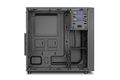 Das ATX-Gehäuse bietet drei 5,25" Einbauschächte für optische Laufwerke (zwei davon sind mit Schnellverschlüssen ausgestattet) oder zwei 5,25" Einbauschächte und einen extern zugänglichen 3,5" Schacht. Hier lässt sich beispielsweise ein Kartenleser schnell und einfach einbauen. Intern können drei 3,5" Festplatten mit Schnellverschlüssen eingebaut werden. Im zweiten Einbaurahmen lassen sich drei 2,5" HDDs/SSDs einbauen, in der Unterseite des Gehäuses ist Platz für eine weitere 2,5" HDD/SSD.
