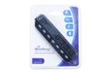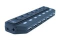 USB 2.0 Verteiler mit sieben Ports zum Anschluss von bis zu sieben USB-Geräten (z.B. Maus, Tastatur, Drucker, externe Festplatte) an einen USB-Anschluss. An jedem Port befindet sich ein Schalter, sodass die einzelnen Verbraucher separat geschaltet werden können. Da die Spannungsversorgung über den USB-Port erfolgt, ist kein zusätzliches Netzteil notwendig.