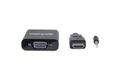 Der Manhattan HDMI auf VGA Konverter ermöglicht den Anschluss eines PCs, Notebooks oder anderen Mediengeräts mit HDMI-Port an einen Bildschirm oder Beamer mit VGA-Port. So können Sie auch ältere Displays noch mit modernen HDMI-Geräten nutzen. Durch die zusätzlich enthaltene Audioverbindung mit Klinkensteckern können Sie über den Konverter auch Audio an ein externes Gerät ausgeben.