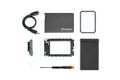 Transcend's SSD/HDD Upgrade Kit enthält ein 2.5 Zoll Gehäuse mit einem gummierten Außengehäuse, ein internes Federungssystem, einen SATA-Adapter, ein USB 3.0 Kabel, einen Adapter (7mm zu 9mm), einen Schraubenzieher und drei Befestigungsschrauben.