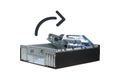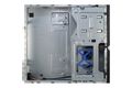 Der Montagekäfig lässt sich um 90° herausdrehen und trägt so zur einfachen, schraubenlosen Montage aller Laufwerke bei. Die integrierten Kabelführungen ermöglichen gutes Verlegen selbiger. Ein Einbauplatz für einen 80mm Lüfter ist ebenfalls vorhanden.