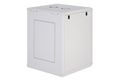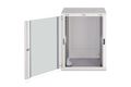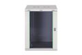 Die Netzwerkschränke zur Wandmontage der Dynamic Serie wurden für einen einfachen und besonders kostenoptimierten Netzwerkausbau entwickelt. Dach, Boden und Rückwand eines jeden Schrankes sind mit einem vorgestanzten Kabeleinlass ausgestattet. Für die Aufnahme eines Lüftermoduls wird das Dachchassis ebenfalls mit einem ausgestanzten Bereich versehen. Zwei Paar galvanisierte, mit in beide Richtungen ablesbare Höheneinheiten beschriftete 483 mm (19")-Profilschienen sind im Inneren verbaut. Diese lassen sich in der Tiefe verstellen. Jeder Schrank ist eine robuste Stahlkonstruktion aus bis zu 1,5 mm starkem Stahlblech. Die Farbgebung erfolgt in Form von elektrostatischer Pulverbeschichtung in den Standardfarben Grau (RAL 7035) und Schwarz (RAL 9005). Abnehmbare Seitenwände sowie die abschließ- und abnehmbare Fronttür, verbessern die Zugänglichkeit. Ein Türanschlagswechsel kann vorgenommen werden. Die Wandmontage erfolgt in zwei einfachen Arbeitsschritten: Das mitgelieferte Montageblech wird an die Wand geschraubt und im Anschluss mit dem Gehäuse verbunden.