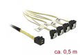 Dieses SAS Kabel von Delock kann zum internen Anschluss von verschiedenen SAS Geräten verwendet werden, z. B. von einem Kontroller mit Mini SAS HD Anschluss an 4 HDDs mit SATA Anschlüssen.