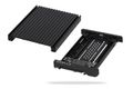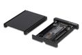 Der aus einem Stück gefertigte Kühlkörper der gleichzeitig auch als Oberseite agiert kann ohne Schrauben oder Werkzeuge aufgesteckt und abgenommen werden und erlaubt so eine einfache, sekundenschnelle Installation der SSD.