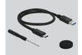 Über eine am Gehäuse verbaute USB Type-C™ Buchse wird das externe Gehäuse mit einem PC oder Notebook verbunden. Das beiliegende USB Type-C™ zu USB Typ-A Kabel ermöglicht den Anschluss an eine freie USB Typ-A Buchse. Selbstverständlich kann das Gehäuse auch via optionalem USB Type-C™ Kabel an eine freie USB Type-C™ Buchse oder einen freien Thunderbolt™ Port angeschlossen werden.