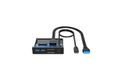 Frontblende mit 2x USB Type-C® / 2x USB Type-A Anschlüssen und Micro SD / SD Kartenleser 1x USB Type-C® mit einer Datenübertragungsrate von bis zu 10 Gbit/s 2x USB Type-A und 1x USB Type-C® mit einer Datenübertragungsrate von bis zu 5 Gbit/s Systemvoraussetzungen: 1x interner USB 3.0 Host (19-polig) Header , 1x interner USB 3.2 Gen 2 Key A Host (20-polig) Header Passt in einen Standard 3,5” (8,89 cm) Schacht Unterstützt Windows®