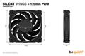 be quiet! SILENT WINGS 4 | 120mm PWM. Typ: Ventilator, Lüfterdurchmesser: 12 cm, Rotationsgeschwindigkeit (max.): 1600 RPM, Luftstrom: 82,74 m³/h, Maximum Luftdruck: 1,79 mmH2O, Lagertyp: Fluiddynamisches Lager (FDB). Spannung: 5 - 13.2 V. Breite: 120 mm, Tiefe: 120 mm, Höhe: 25 mm. Produktfarbe: Schwarz