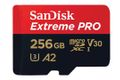 SanDisk Extreme PRO. Kapazität: 256 GB, Flash Card Typ: MicroSDXC, Flash-Memory-Klasse: Klasse 10, Interner Speichertyp: UHS-I, Lesegeschwindigkeit: 200 MB/s, Schreibgeschwindigkeit: 140 MB/s, UHS Speed Klasse: Class 3 (U3), Video-Geschwindigkeitsklasse: V30. Schutzfunktion: Schockresistent, Temperaturbeständig, Wasserfest, Röntgensicher, Produktfarbe: Schwarz, Rot