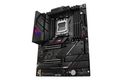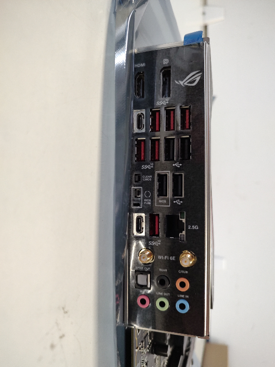 Das kantige und elegante ROG Strix B650E-E hat eine Premium-Ästhetik, die an die Electro Punk Peripheriegeräte-Serie erinnert. Schwarze Abdeckungen bedecken die SSDs und den Chipsatz mit kontrastierenden pulverbeschichteten und gebürsteten Metalltexturen, und verspielte rosa Akzente lenken den Blick auf das Board. Auf der Anschlussabdeckung prangt eine geteilte Abbildung des ROG-Auges, in deren Mitte ein Spritzer anpassbarer RGB-Farben leuchten kann.