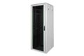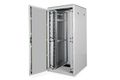 Die Netzwerkschränke der Varioflex-N Serie wurden für eine optimale Verkabelung von Netzwerkkomponenten designt und produziert. Durchdachte Optimierungen bieten marktkonforme Stabilität bei maximaler Flexibilität. Ein modular, durch verschraubte 483 mm (19")-Blindplatten öffenbares Bodenchassis bietet ausreichend Platz für Kabel aller Art. Darüber hinaus befinden sich jeweils zwei Kabeleinlässe mit Bürste oben und unten im Schrank, sowie ein weiterer im hinteren Bereich des Bodenchassis. Großzügige vertikale Kabelkanäle mit Kabelführungshilfen aus Kunststoff und Blende, verbaut in der Frontseite, runden die vielfältigen Eigenschaften des Netzwerkschranks einwandfrei ab. Ein abgesetzter, abnehmbarer Deckel mit Lüftungsschlitzen sorgt für eine verbesserte Luftzirkulation. Dieser sitzt über einer speziellen Konstruktion für die einfache Aufnahme eines Lüftermoduls. Im Inneren des Schrankes sind vier verkröpfte, galvanisierte 483 mm (19")-Profile integriert, welche an mehreren Stellen über Tiefenstreben mit dem Grundgerüst des Schrankes verbunden sind. Sie sind tiefenverstellbar und besitzen eine Markierung der jeweiligen Höheneinheit, lesbar in beide Richtungen. Jeder Schrank ist eine robuste Stahlkonstruktion aus bis zu 1,5 mm starkem Stahlblech. Die Farbgebung erfolgt in Form von elektrostatischer Pulverbeschichtung in den Standardfarben Grau (RAL 7035) und Schwarz (RAL 9005). Modular abschließ- und abnehmbare Seitenwände und Türen verbessern die Zugänglichkeit. Ein Türanschlagswechsel kann vorgenommen werden. Des Weiteren sind die Schränke auf Grund der zerlegbaren Konstruktion bei Bedarf komplett demontierbar.