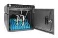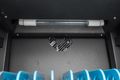 Der mobile Ladeschrank von DIGITUS® ist die ideale und kompakte Lösung zur Aufbewahrung und zum Aufladen Ihrer portablen Geräte, wie z. B. Notebooks und Tablets. Häufig werden mobile Ladeschränke in öffentlichen Einrichtungen wie z. B. Schulen genutzt, um die Geräte an einem zentralen Ort gesichert aufzubewahren und gleichzeitig laden zu können. Der Schrank beinhaltet 10 Ladeplätze, von dem jeder über einen eigenen USB-Anschluss an der Vorderseite verfügt. Dank integrierter LED-Indikatoren haben Sie jederzeit den Ladevorgang im Blick (Rot: Ladevorgang; Grün: Ladevorgang beendet/kein Gerät angeschlossen). Abriebfeste Standfüße sorgen für einen rutschfreien Aufbau. Ein verbauter Lüfter in Verbindung mit Lüftungsschlitzen sorgt für eine aktive Entwärmung des Schrankes. Verbaute UV-C Lampen sorgen für sterilere Verhältnisse und somit eine umweltfreundliche, verbesserte Hygiene.