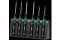 Hochwertiger Wera Micro Schraubendrehersatz für feinmechanische Verschraubungen. Kugelkopfprofil: Durch die kugelförmigen Abtriebsprofile ist ein Auslenken oder Schwenken der Werkzeugachse zur Schraubenachse möglich, so dass dadurch "um die Ecke" geschraubt werden kann. Durch Abstützen der Hand auf der Drehkappe und durch die Schnelldrehzone unterhalb der Drehkappe ist blitzschnelles Zwirbeln möglich. Zeitintensives Umgreifen entfällt. Kraftzone mit integrierten Weichzonen sorgt für die Übertragung hoher Löse- und Anzugsmomente. Präzisionszone für den richtigen Drehwinkel bei Justierarbeiten. Die Wera Black Point-Spitze bietet Passgenauigkeit und optimierten Korrosionsschutz.