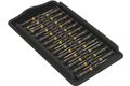 Elektrostatisch abgesicherter 25-teiliger Wera Micro Schraubendrehersatz. Enthaltene Schraubprofile besonders geeignet für den Einsatz an Mobiltelefonen, Tablets und Laptops/Computern. Sicherer Schutz vor elektrostatischer Energie und damit verbundenen Schäden. Durch Abstützen der Hand auf der Drehkappe und durch die Schnelldrehzone unterhalb der Drehkappe ist blitzschnelles Zwirbeln möglich. Zeitintensives Umgreifen entfällt. Kraftzone mit integrierten Weichzonen sorgt für die Übertragung hoher Löse- und Anzugsmomente. Präzisionszone für den richtigen Drehwinkel bei Justierarbeiten. Die Wera Black Point-Spitze bietet Passgenauigkeit und optimierten Korrosionsschutz. Take it easy Werkzeugfinder mit Farbkennzeichnung nach Profilen und Größenstempelung – zum einfachen und schnellen Finden des benötigten Werkzeugs. Aufbewahrung und Transport in robuster textiler Tasche, so ist das Werkzeug gut geschützt und immer schnell zur Hand.