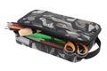 Allrounder; geräumiges Hauptfach mit Reißverschluss; Klappe mit Stifteschlaufen und Geodreieckfach inkl. Geometriedreieck; Netztasche; Außenmaterial Polyester; farbiges Innenfutter; leichter Transport; für Schule; Uni; Beruf oder Freizeit; Maße: 21 x 13 x 6 cm, Material: Polyester; CamoGrey.