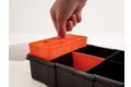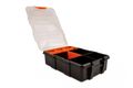 Durch Umsetzen der Trennwand in der Mitte der Sortimentsbox kann die Größe der einzelnen Fächer individuell verstellt werden. Eine kleinere Box mit je 5 Fächern im hinteren Teil kann herausgenommen werden und schafft weiteren Platz, um mehrere Gegenstände zu verstauen.
