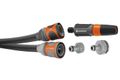 Das sofort einsatzbereite Set beinhaltet neben dem Liano™ Life die vormontierten Original GARDENA Systemteile Liano™ Wasserstop und Liano™ Schlauchverbinder, eine Reinigungsspritze sowie zwei Hahnverbinder. Einer der Hahnverbinder ist mit einem Reduzierstück ausgestattet, sodass der Schlauch an insgesamt drei Hahngrößen angeschlossen werden kann.