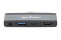 Nutzen Sie das volle Potenzial Ihres USB-C-Geräts mit dieser mobilen 4-in-1 HDMI Docking Station von Manhattan. Der vielseitige Multiport Docking-Konverter erweitert Ihren Laptop (oder ein anderes Gerät) um ein HDMI-Display, ein USB-A-Peripheriegerät, ein Headset und 100 W Power Delivery für mehr Komfort und Produktivität.